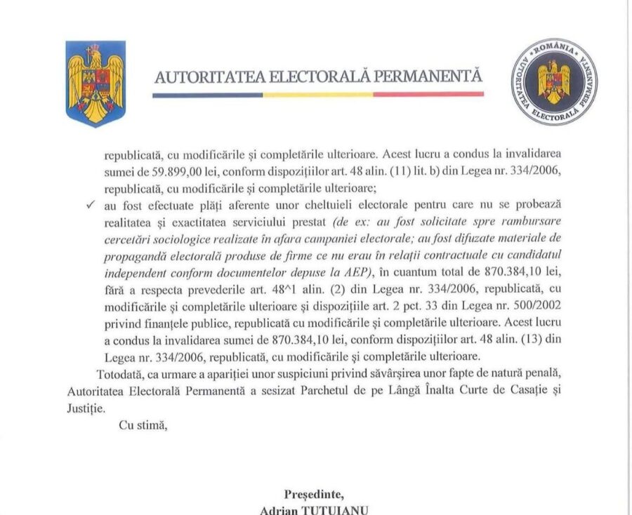 Totodată, ca urmare a apariției unor suspiciuni privind săvârşirea unor fapte de natură penală, Autoritatea Electorală Permanentă a sesizat Parchetul de pe Lângă Înalta Curte de Casaţie și Justiție”, se mai arată în documentul semnat de Adrian Țuțuianu, actualul președinte al AEP, susținut de PSD.