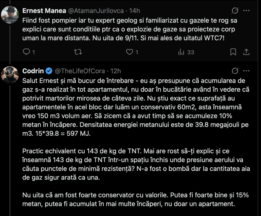 ”Fiind fost pompier iar tu expert geolog si familiarizat cu gazele te rog sa explici care sunt conditiile pentru ca o explozie de gaze sa proiecteze corp uman la mare distanta. Nu uita de 9/11. Si mai ales de uitatul WTC7!”, a fost interpelat specialistul pe X. Expertul a avusese deja mai multe opinii legate de cauzele exploziei.