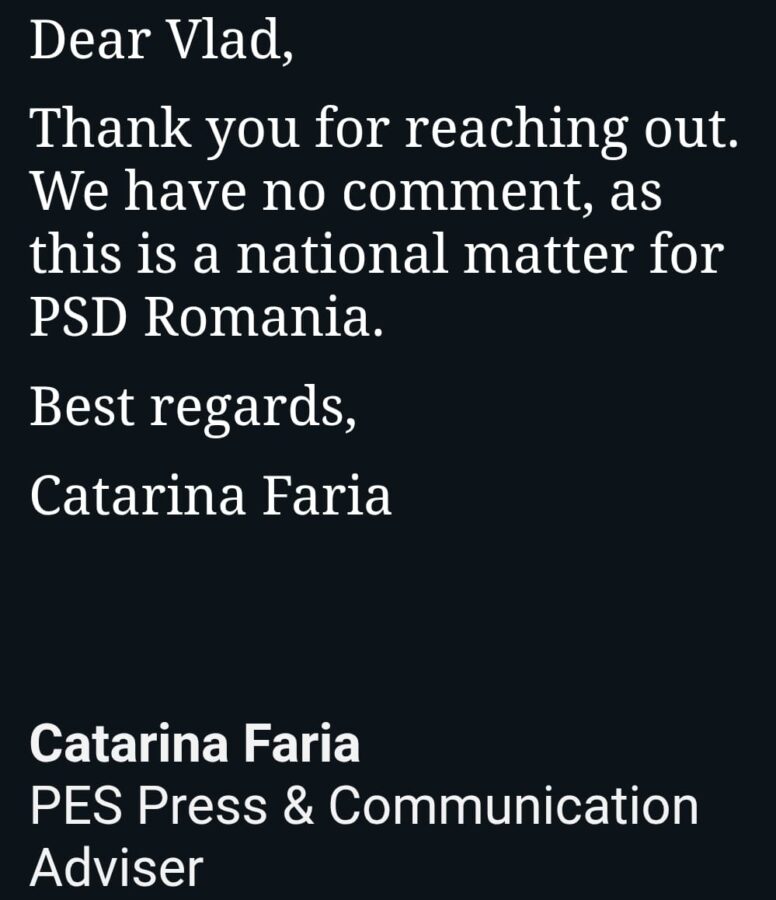 PressHUB: Deci consideri că poziția PES de neutralitate față de schimbarea din PSD nu este întâmplătoare?Am contactat PES pentru a le cere o poziție față de modificarea statutului. Ei au catalogat-o drept o chestiune strict internă.