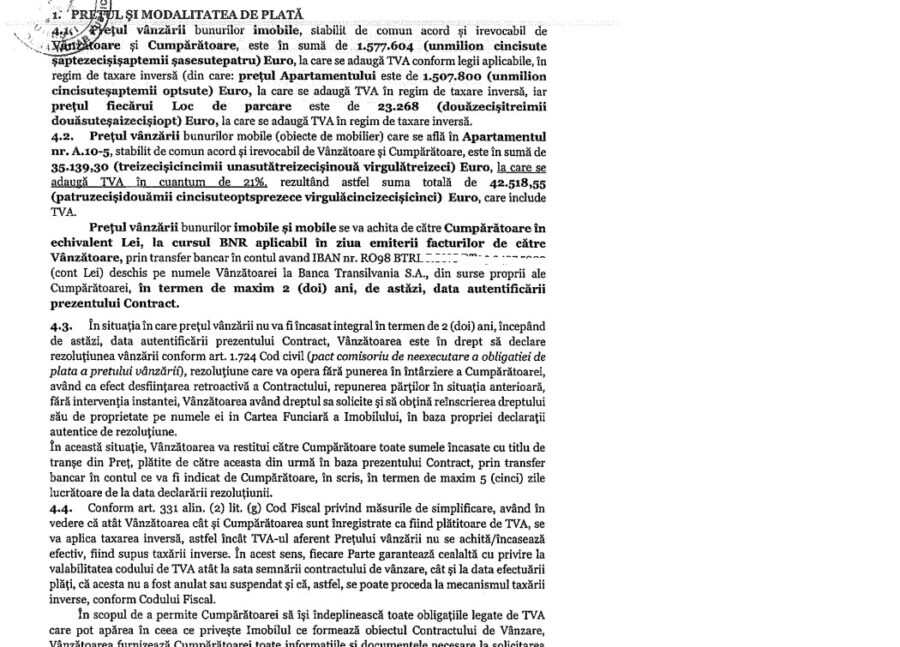 Potrivit contractului, prețul apartamentului și a locurilor de parcare se vor achita „în termen de maxim 2 (doi) ani, de astăzi, data autentificării prezentului Contract”. „În situația în care preţul vânzării nu va fi încasat integral în termen de 2 (doi) ani, începând de astăzi, data autentificării prezentului Contract, Vânzătoarea este în drept să declare rezoluțiunea vânzării conform art. 1.724 Cod civil (pact comisoriu de neexecutare a obligatiei de plata a pretului vânzăriî), rezoluţiune care va opera fără punerea în întârziere a Cumpărătoarei, având ca efect desființarea retroactivă a Contractului, repunerea părţilor în situaţia anterioară, fără intervenția instantei, Vânzătoarea având dreptul sa solicite şi să obţină reînscrierea dreptului său de proprietate pe numele ei in Cartea Funciară a Imobilului, în baza propriei declarații autentice de rezoluţiune”, se mai arată în document.