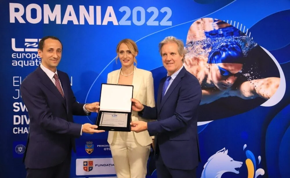 Președintele Ligii Europene de Natație(LEN) Antonio Silva, alături de Camelia Potec, membru în Comitetul Executiv LEN, a oferit o plachetă președintelui COSR, Mihai Covaliu.