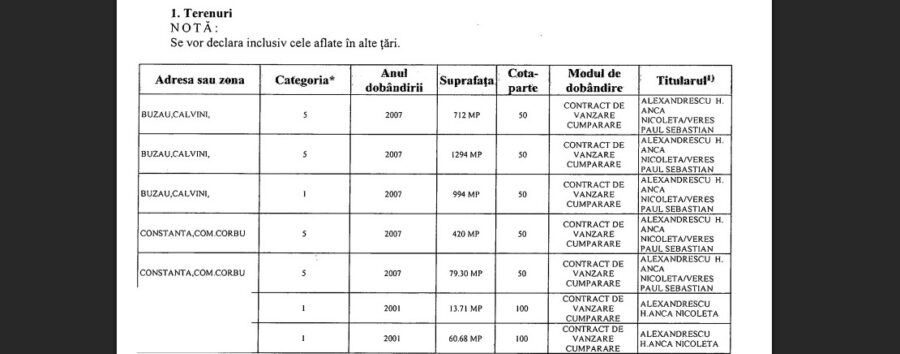Din aceleși document rezultă că deținea la acel moment șapte terenuri, dintre care cinci în coproprietate cu Paul Sebastian Vereș. Trei dintre terenuri erau situate în comuna Calvini, județul Buzău, și două, în comuna Corbu din Constanța. Toate au fost cumpărate în 2007.