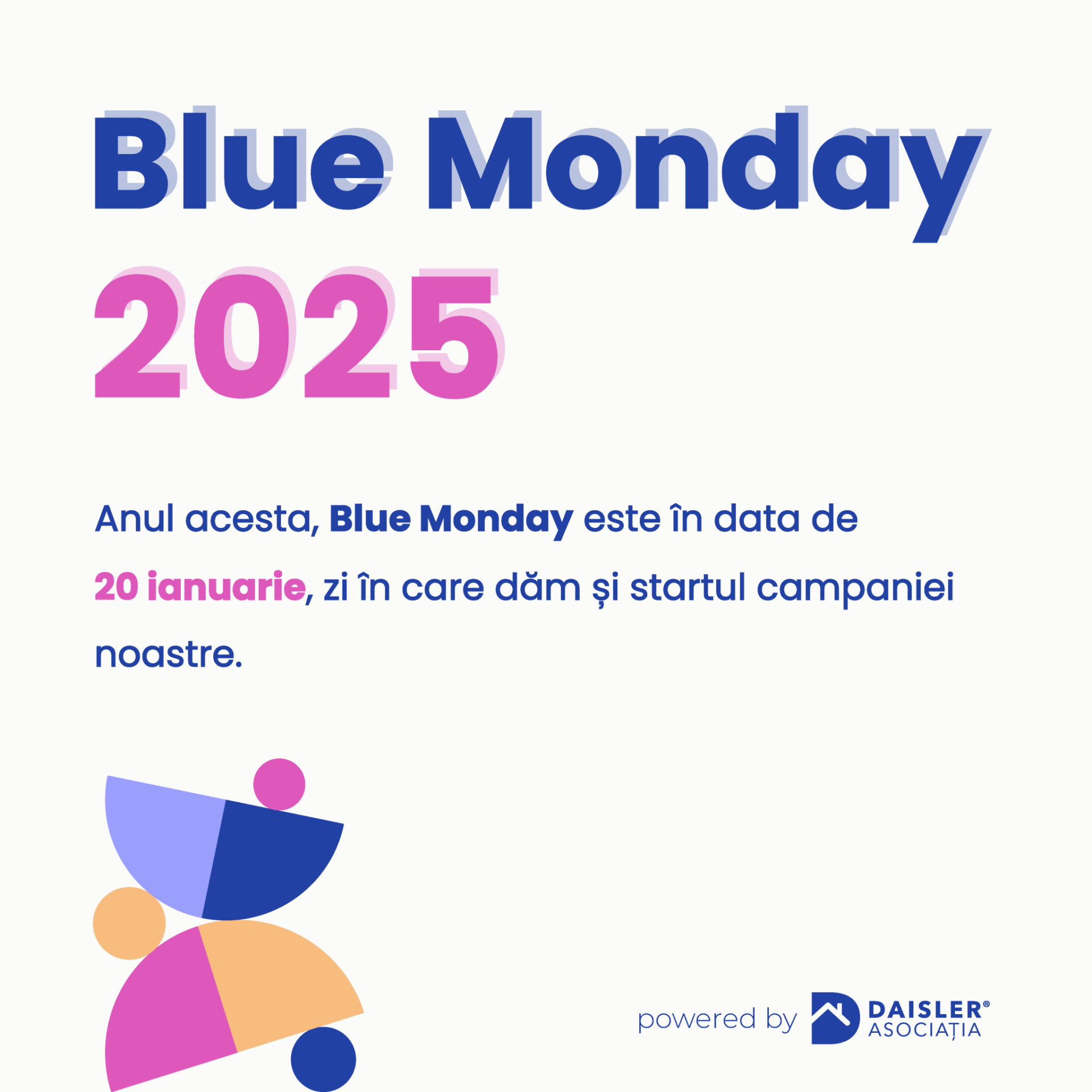 Blue Monday este campania prin care sute de psihologi din toată țara, empatici față de acest context, își oferă serviciile și experiența în mod gratuit pentru toți participanții care se înscriu pe platforma bluemonday.ro. Deși considerată în mod popular cea mai deprimantă zi de peste an, Blue Monday este prilejul ideal prin care Asociația Daisler pune la dispoziția publicului român de peste tot o resursă extrem de vitală în zilele noastre, și anume acces gratuit la psihologi și psihoterapeuți care pot contribui la îmbunătățirea sănătății mintale.