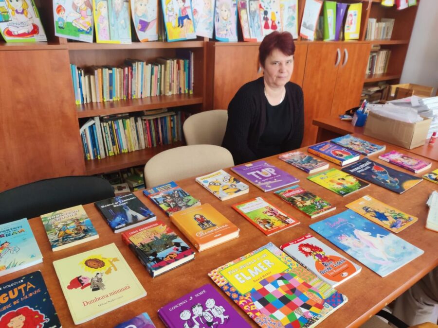 Pe o masa lungă, stau așezate cărțile pentru copii, așa cum le place lor să le găsească. „Dacă le înșir astfel, îi atrag să le citească”, ne spune doamna Anca, „le iau mai ușor de pe masă decât de pe raft. Eu îi mai și păcălesc, că le schimb des și ei zic: Vai, doamnă, ați adus cărți noi!”