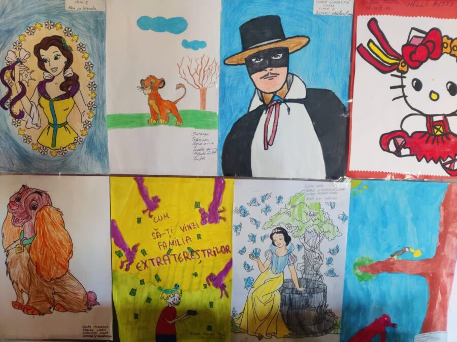 Încăperea bibliotecii este destul de mare, plină de desene colorate făcute de elevi. Lucrările lor, expuse încă din hol, înfățișează personaje din cărțile citite. Ne zâmbesc de pe hârtie Zorro, Heidi, dar și cineva care ne arată „Cum să-ți vinzi familia extratereștrilor”.