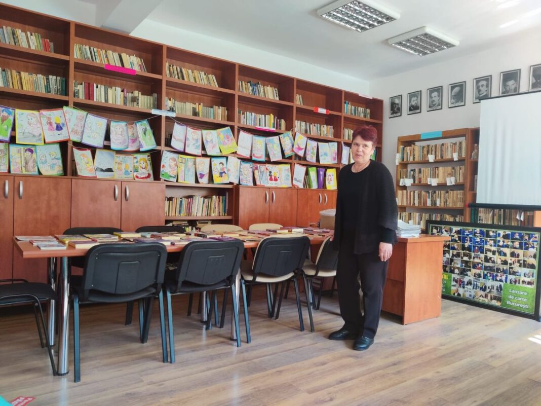 Încăperea bibliotecii este destul de mare, plină de desene colorate făcute de elevi. Lucrările lor, expuse încă din hol, înfățișează personaje din cărțile citite. Ne zâmbesc de pe hârtie Zorro, Heidi, dar și cineva care ne arată „Cum să-ți vinzi familia extratereștrilor”.
