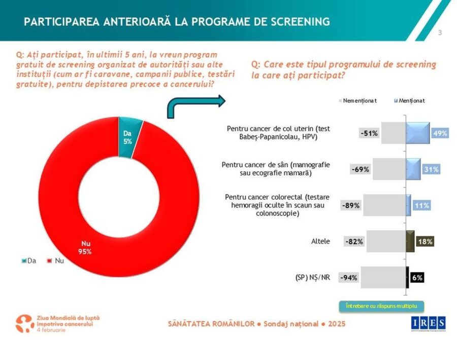 Un sondaj național realizat de IRES arată clar această fractură: doar 5% dintre români spun că au participat, în ultimii cinci ani, la un program gratuit de screening pentru depistarea precoce a cancerului, în timp ce 95% nu au participat deloc.