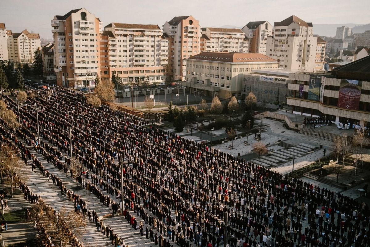 La fel ca în fiecare an, oamenii au început să vină pe platoul din centrul oraşului cu mult înainte de ora 8:00, atunci când a început slujba religioasă, şi s-au aşezat în rânduri lungi, care s-au întins chiar şi pe străzile adiacente, circulaţia fiind întreruptă timp de aproximativ o oră.