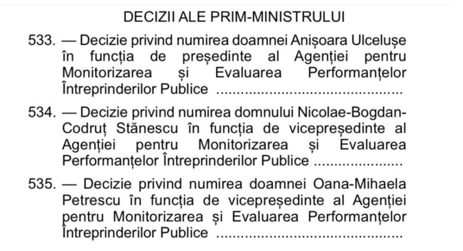 Premierul Ilie Bolojan a numit-o pe Anişoara Ulceluşe în funcția de preşedinte al Agenției pentru Monitorizarea și Evaluarea Performanțelor Întreprinderilor Publice (AMEPIP). Ceilalți doi vicepreședinți care au câștigat concursurile sunt Nicolae Bogdan Codruț Stănescu și Oana Mihaela Petrescu.