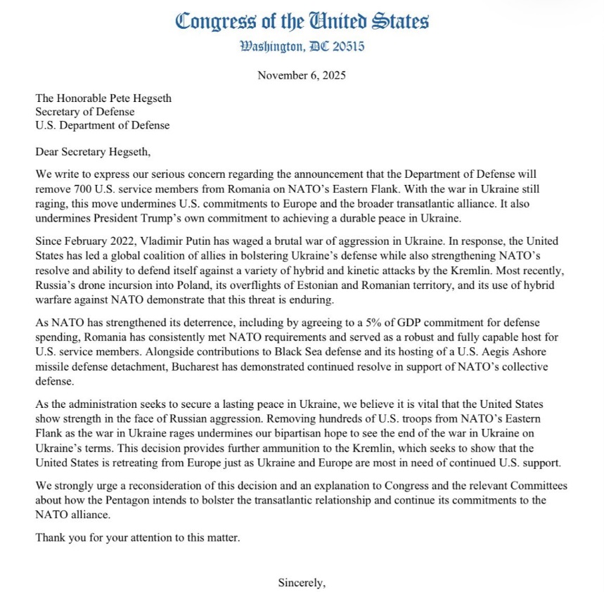 Într-un moment atipic de consens politic, congresmeni democrați și republicani au criticat decizia administrației Trump privind reducerea trupelor din România. Printr-o scrisoare pe care i-au înaintat-o Secretarului Apărării, Pete Hegseth, aceștia indică faptul că mișcarea îi transmite un semnal greșit președintelui rus Vladimir Putin și riscă să submineze procesul de încetare a focului în Ucraina, relatează Kyiv Post.