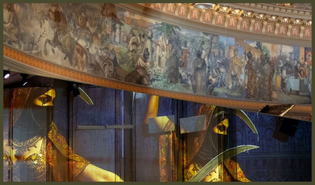 Nu știu de ce mi-a venit în minte, posibil, fiind legat tot de vizual, coincidența temporală, fresca Ateneului. Șeherezada a fost compusă în același an cu inaugurarea Ateneului, 1888. Fresca este realizată mult mai târziu (’33-’38). Demult, mai aveam în cap întrebarea de ce nu s-au folosit mai multe nume din tot arsenalul de mari pictori ai vremii, de ex. Cuțescu-Stork, Ressu, Tonitza, Löwendal, Verona, sau de ce n-a fost un concurs, ci, s-a preferat un specialist în pictura a fresco, un meșter, dar care, și așa, ar fi putut lucra (și) după schițele altora. Sau varianta propusă inițial, inspirată de Panteonul din Paris, cu tablouri. Se spune că alegerea lui Costin Petrescu, pictor, frescar, a fost dictată de un preț mai bun!? Acum, nu știu câte oferte s-au depus, știm că Petrescu avea conexiuni cu personalități ale vremii, pictându-le portrete, a fost și designerul mantiei regale de la încoronarea regelui Ferdinand I. Probabil, s-a mizat și pe experiența sa ca pictor de război, pe care o aveau și alții. Dar știți cum e, totul e subiectiv când vine vorba de linii, culori…