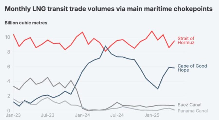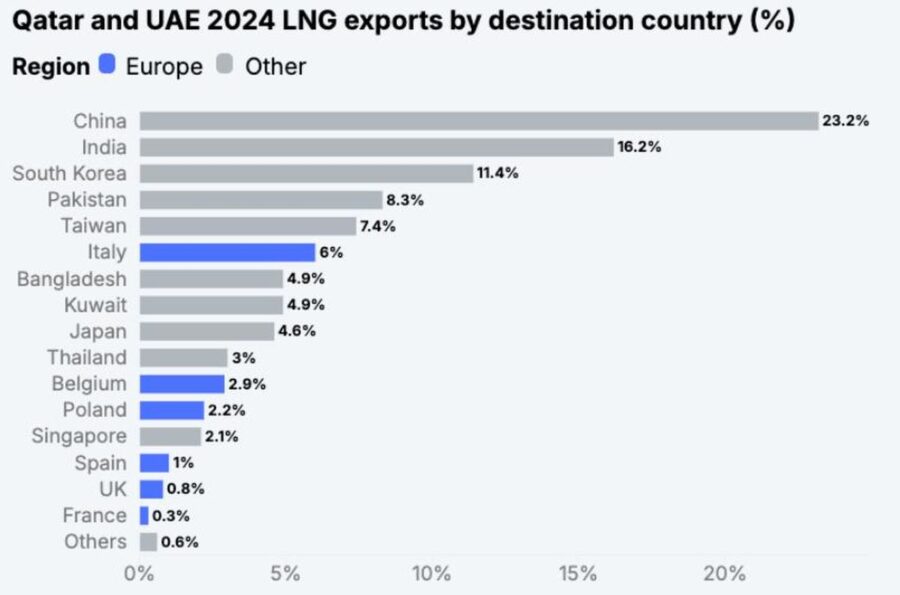 Principalele destinații de export pentru gazul natural lichefiat (GNL) din Orientul Mijlociu, care tranzitează Strâmtoarea Ormuz, sunt țările asiatice (78,1%), cu China în frunte (aproximativ 25%) și India pe locul doi (circa 17%).