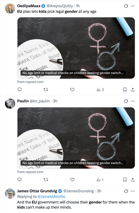 Pe rețeaua X (fostul Twitter), conturi influente au amplificat mesajul, publicând capturi de ecran și fragmente scoase din contextul strategiei europene. Postările au fost însoțite de afirmații alarmiste precum „UE vrea să elimine părinții din procesul de decizie privind genul copiilor” sau „Bruxelles impune tranziția forțată”. Aceste mesaje au acumulat numeroase vizualizări și au fost ulterior traduse și redistribuite pe TikTok, unde clipuri scurte cu subtitrarea „Brussels allows kids to change sex at any age” au atins audiențe masive în rândul tinerilor.