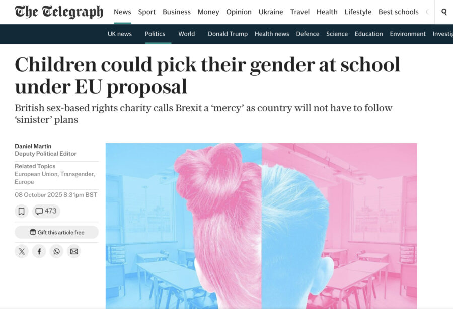 The Telegraph a speculat imediat situatia și a publicat un articol intitulat „Children could pick their gender at school under EU proposal”, în care prezenta formularea din strategia UE ca pe o propunere reală de a permite copiilor să aleagă genul legal indiferent de vârstă. În acest articol, titlul sugerează că decizia ar fi aplicabilă în instituțiile școlare, iar textul introduce ideea ca dacă cineva sub 18 ani vrea, poate schimba genul legal — fără a face distincția între recunoaștere juridică și intervenție medicală.