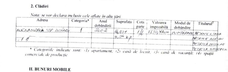 Potrivit declarației de avere din 2009, Liana Arsenie, împreună cu soțul Adrian, cumpărau un apartament pe strada Dunării din Alexandria. Locuința a fost cumpărată împreună cu alți doi proprietari, respectiv Gheorghița și Nicolae Petrică. Cota parte a fiecărui proprietar era de ¼ din apartament.