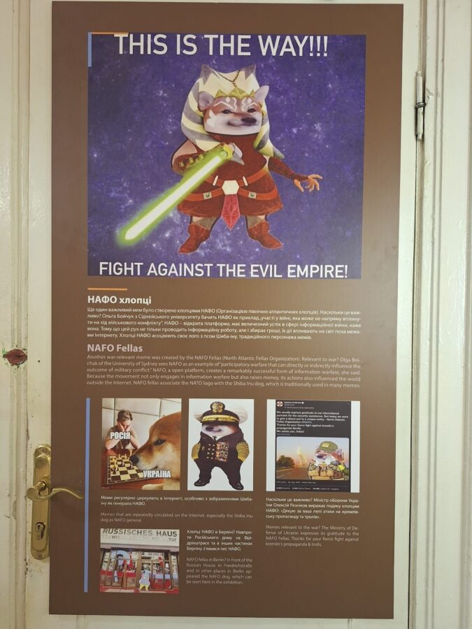 Organizația NAFO (North Atlantic Fella Organization) este o comunitate online de activiști și voluntari care luptă împotriva propagandei rusești pe internet și strâng fonduri semnificative pentru a sprijini forțele de apărare și ajutoarele umanitare din Ucraina. Acesta apare și el în muzeul militar și imaginea cu „The Fella” (câinele Shiba Inu) care circulă pe internet cu scop umoristic, subliniază rolul organizației NAFO ca fiind un model de luptă eficientă în războiul informațional.