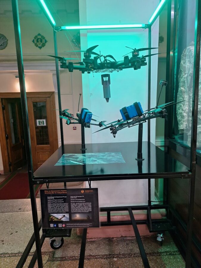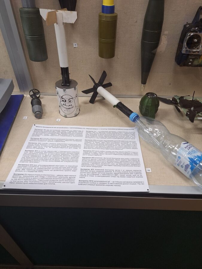 Această expoziție prezintă modele de muniții și dispozitive explozive improvizate dezvoltate de forțele ucrainene, unități de voluntari și ONG-ul „Aerorozvidka”. Necesitatea a forțat adaptarea, astfel că se folosesc inclusiv materiale reciclate (Modelul Nr. 2), sticle de plastic (Nr. 1) și tehnologie de bază. Sunt expuse încărcături adaptate din grenade sovietice (Nr. 4 și 7) și proiectile antitanc RPG-7 (Nr. 8), transformate în muniții eficiente pentru drone. În multe cazuri (Nr. 4, 6, 8), componentele cheie precum aripioarele stabilizatoare sunt realizate prin imprimare 3D. Munițiile sunt variate, de la încărcături chimice și fragmentare (Nr. 2) la proiectile antitanc folosite pentru a lovi ținte în tranșee (Nr. 9), inclusiv versiuni modernizate pentru a se încadra în standardele NATO (Nr. 5).