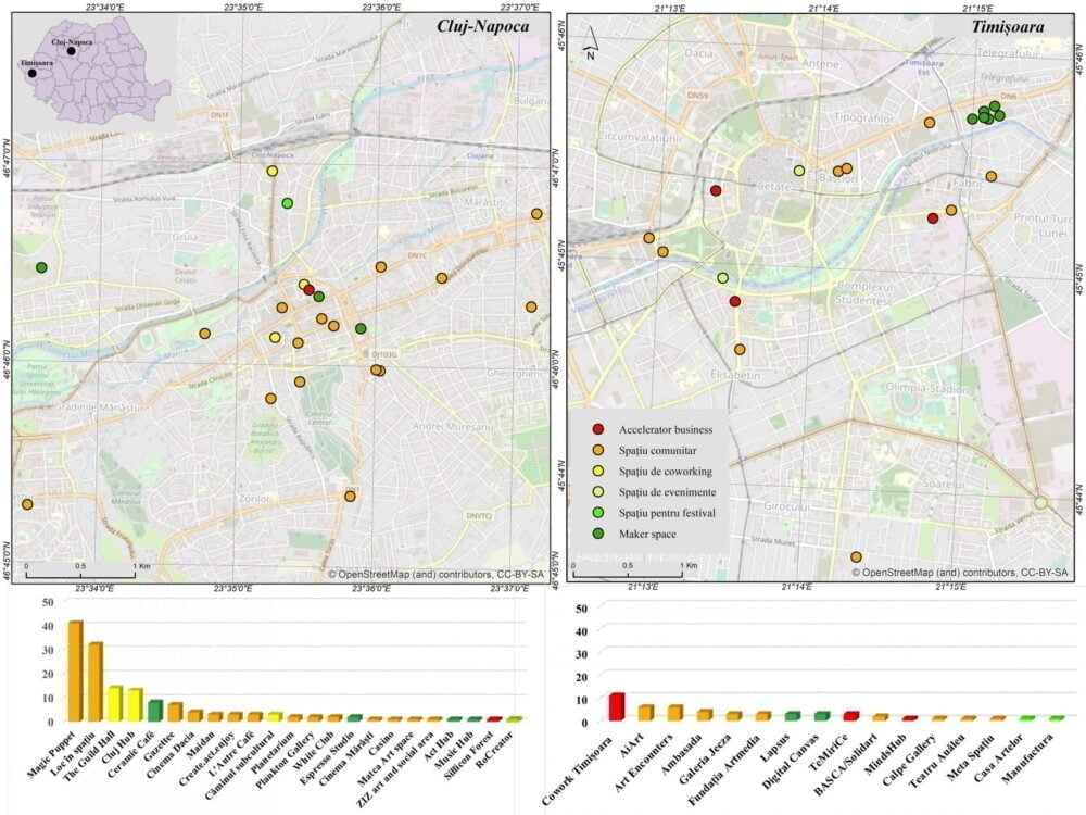 Comunitatea de artiști independenți din Cluj-Napoca și Timișoara însumează 126 locații (Cuantificarea spațiilor creative din cele două orașe a constituit unul din rezultatele proiectului CREATONVIL/17-AUF: Patrimoniu şi înnoire urbană: spaţiile creative, cultura inclusivă şi antrenarea spiritului civic, proiect finanţat prin Programul PN III/Subprogramul 3.1.).