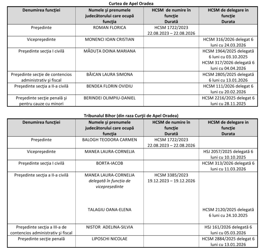În ultimii trei ani, funcțiile de conducere de la Curtea de Apel Oradea, cu excepția celei de președinte de instanță, au fost ocupate prin delegări succesive dispuse de Secția pentru judecători a Consiliului Superior al Magistraturii (CSM). Vicepreședintele instanței și alți patru președinți de secții sunt delegați de CSM.