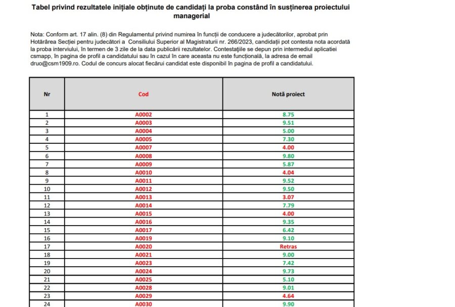 Examenele judecătorilor pentru funcțiile de conducere ale instanțelor încep să producă primele surprize. Potrivit informațiilor preliminare privind rezultatele obținute de aceștia la prezentarea proiectului managerial avem doi candidați notați cu 10 și opt cu note sub 5 dintr-un total de 46.