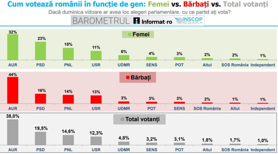 Deși ordinea ierarhică a partidelor se menține intactă (AUR; PSD; PNL; USR etc.), sondajul indică o diferență de 12 procente în preferințele de vot față de principala formațiune extremistă (AUR). Astfel, femeile votează în procent de 32% pentru AUR, spre deosebire de 44% din bărbați. Procentele sunt egale în privința celorlalte formațiuni extremiste: 3% POT; 2% SOS România.