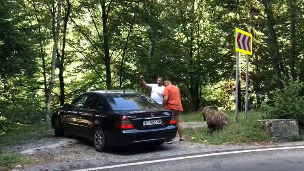 În filmulețul postat în mediul online se vede cum dintr-o mașină cu plăcuțe cu numere de înmatriculare de Ucraina sau Bulgaria, coboară doi bărbaţii care hrănesc animalul.