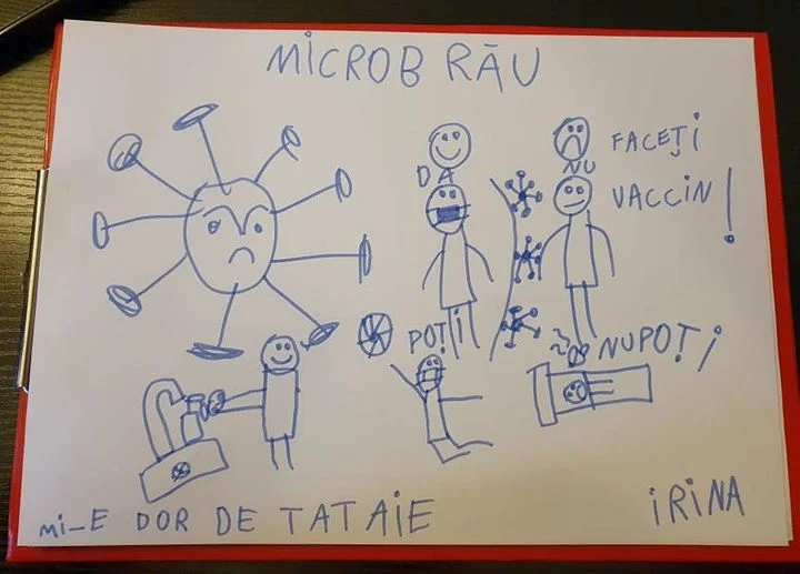 RO Vaccinare a postat, marți, pe Facebook, desenul unui copil al cărui mesaj tulburător îndeamnă la vaccinare, un desen despre realitatea zilelor noastre, despre dramele provocate de virusul SARS-COV-2, văzută prin ochii unui copil: „COVID = MICROB RĂU”.