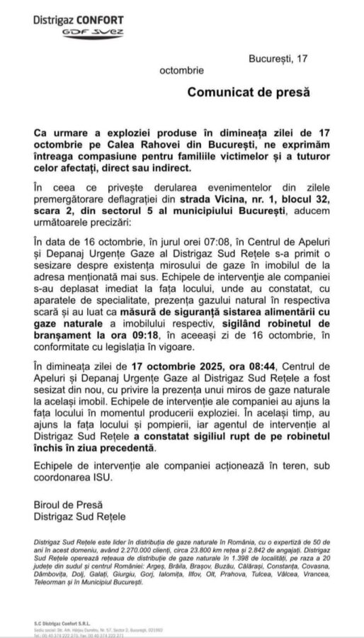 Distrigaz a venit cu un comunicat de presă prin care a declarat că echipe de intervenție ale companiei fuseseră trimise pe data de 16 octombrie la solicitarea locatarilor, care au susținut că simt miros de gaz. Echipele au confirmat prezența gazului în scară și sigiilat robinetul de branșment, împiedicând alimentarea blocului.