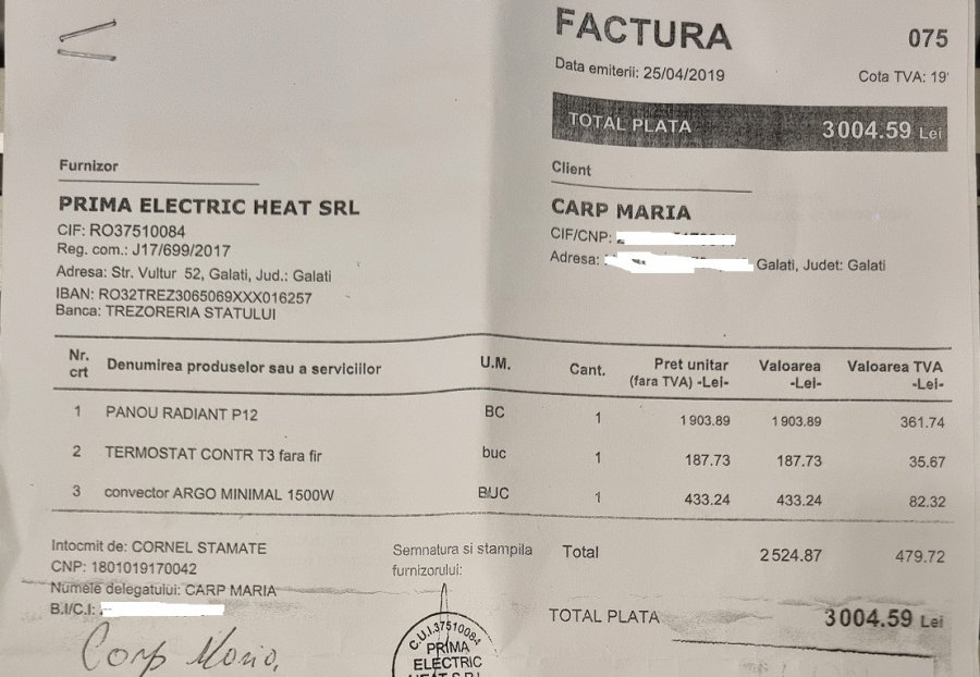 Doamna Maria Carp a semnat, pe 25 aprilie 2019, un contract cu firma Prima Electric Heat SRL, cu sediul în str. Vultur nr. 52, pentru achiziționarea unui sistem de încălzire alternativ, compus dintr-un panou radiant P12, un termostat fără fir și un convector Argo Minimal de 1.500 W. Suma totală pentru care s-a făcut achiziția a fost de 3.004,59 lei, suspect de apropiată ca valoare de cea a voucherului de 3.000 de lei oferit de Primăria Galați.