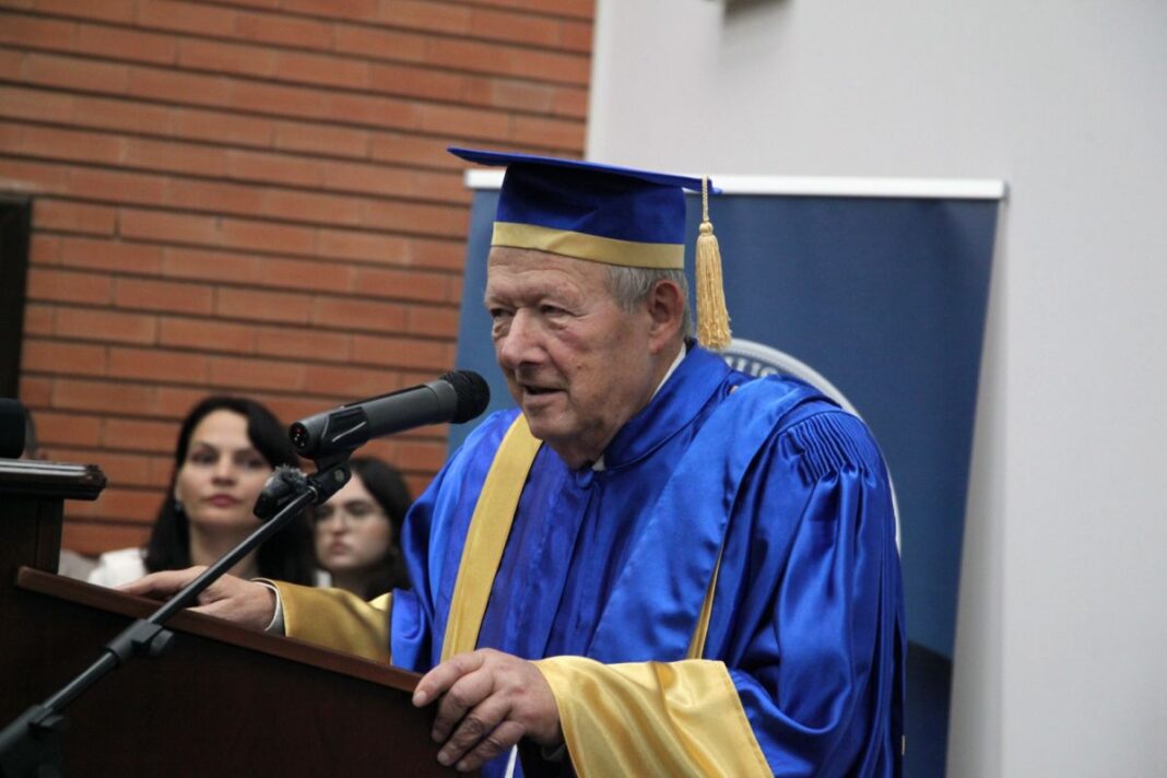 În cuvântul de mulţumire, Adam Michnik a creat, chiar dacă nu neapărat voluntar, un moment plin de umor, declarând: „Sincer să fiu, mă simt ca şi când aş fi la propria înmormântare. Pentru că doar la înmormântare se vorbeşte întotdeauna de bine”. Dincolo de această glumă, fostul disident anticomunist a mărturisit că este o reală onoare pentru el faptul că într-o universitate din România sunt amintite valorile pe care el s-a străduit să le slujească toată viaţa. În acest context, Adam Michnik a declarat: „Astăzi, Europa şi întreaga lume devin cenuşii, iar valorile (n. r. democratice) sunt ameninţate. România şi Republica Moldova sunt două ţări care au înţeles că aceste valori merită şi trebuie să fie apărate. Cu ajutorul buletinului de vot, la prezidenţialele din România a fost oprită puterea autoritarismului. E un moment de referinţă pentru Europa, pentru întreaga lume şi pentru ţara mea”.