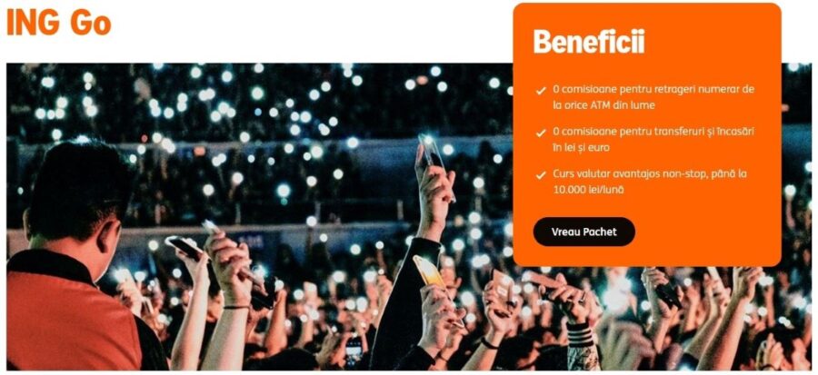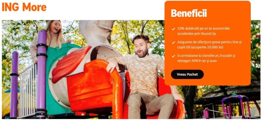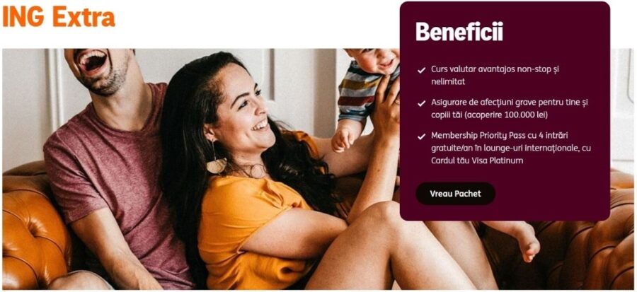 ING More (Stil de viață): Disponibil pentru 39 de lei pe lună, acest pachet introduce cardul Visa Gold, asigurarea de boli grave (limită 20.000 lei), trei intrări gratuite pe an în lounge-urile aeroporturilor interne și discounturi la servicii de transport (BlackCab).