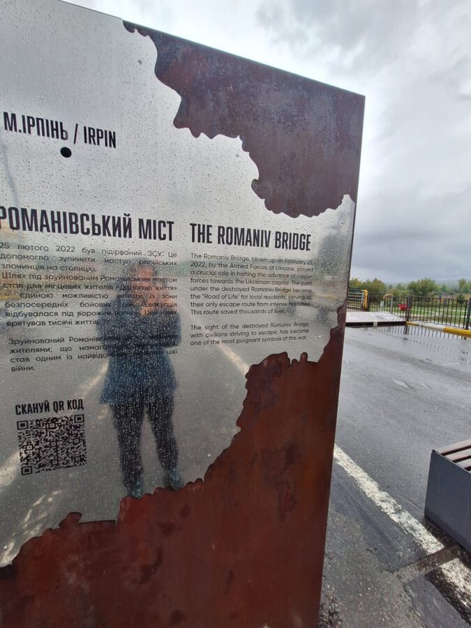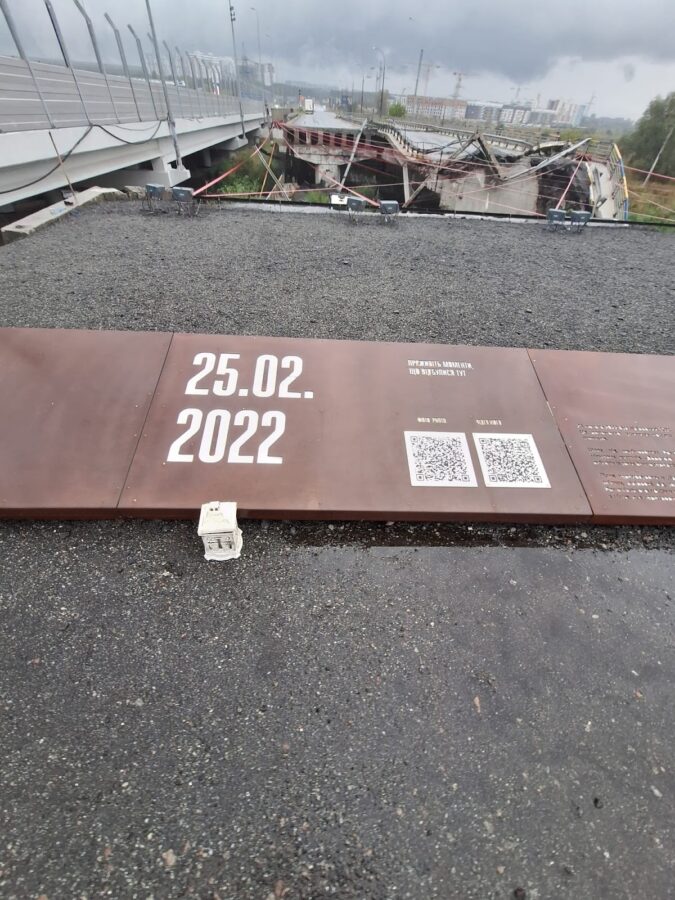 ”Podul Romaniv, aruncat în aer pe 25 februarie 2022 de către Forțele Armate ale Ucrainei, a jucat un rol cheie în oprirea forțelor ruse invadatoare care se îndreptau spre capitala Ucrainei. Calea de sub podul Romaniv distrus a devenit „Drumul Vieții” pentru rezidenții locali, fiind singura lor rută de evacuare din calea ostilităților intense. Podul a salvat mii de vieți.Imaginea Podului Romaniv distrus, cu civilii luptând să scape, a devenit unul dintre cele mai grăitoare simboluri ale războiului.”