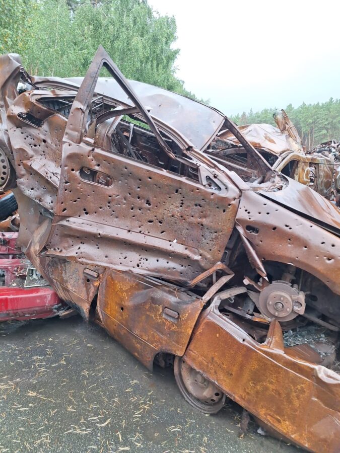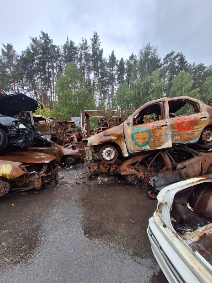 Tot în Irpin, la ieșirea din oraș, se află expuse mașinile personale ale civililor care erau evacuați din din Irpin, Bucha și Hostomel. Multe dintre acestea au fost abandonate în zona critică de lângă Podul Romaniv. O parte dintre vehicule poartă urme clare de gloanțe și șrapnel, indicând faptul că au fost ținta directă a forțelor ruse în timp ce șoferii și pasagerii încercau să fugă. Cazul cel mai tragic este cel al coloanei de pietoni (inclusiv familia Perebyinis) care a fost ucisă de mortiere pe 6 martie, dar și al altor vehicule civile care au fost atacate pe drumurile de evacuare.