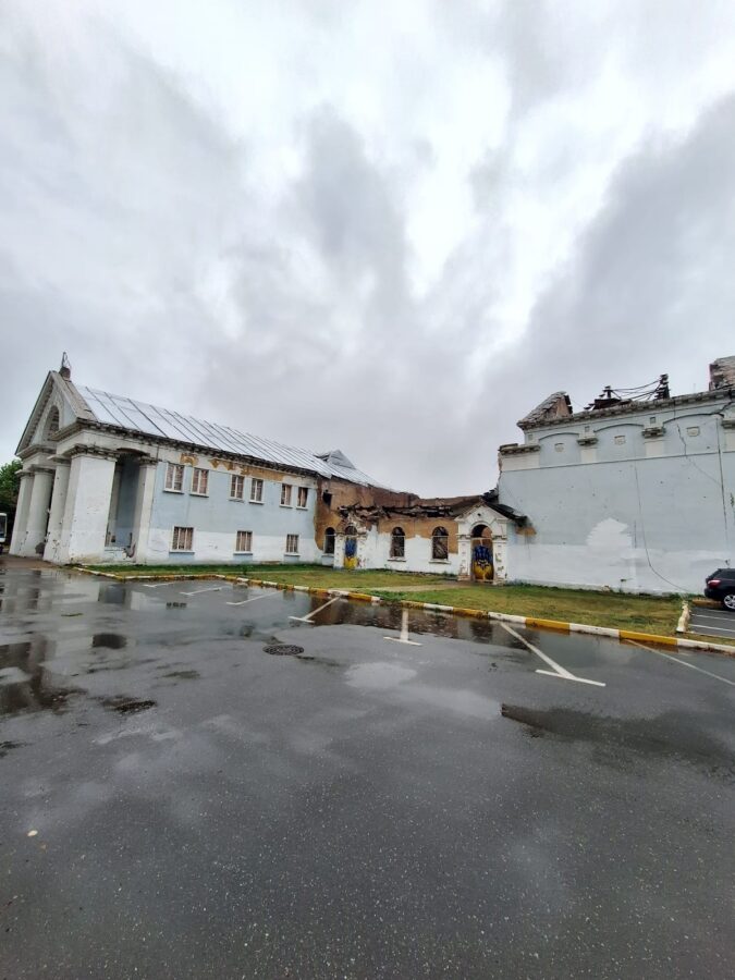 Clădirea este după cum se vede în poze, distrusă aproape total. La intrare, sunt câteva statui, tot din epoca sovietică: un muncitor și o mamă cu un copil. Ambele sunt găurite de proiectile. Din auditorium, folosit odată și ca sală de cinematograf, au mai rămas doar pereții și câteva decorațiuni specifice. Pe dinafară, ce a mai rămas în picioare, e acoperit de graffiti și de mesaje anti război sau susținere pentru Ucraina.