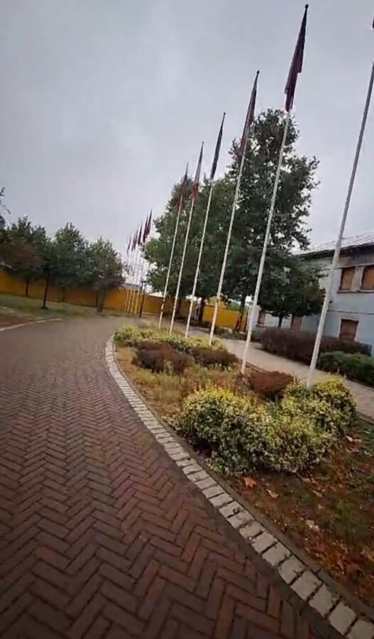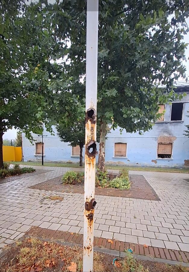 În partea din stânga a clădirii, stâlpii de pavilion care țineau mai demult steagurile internaționale din fața muzeului sunt și ei ciuruiți de gloanțe și shrapnel.