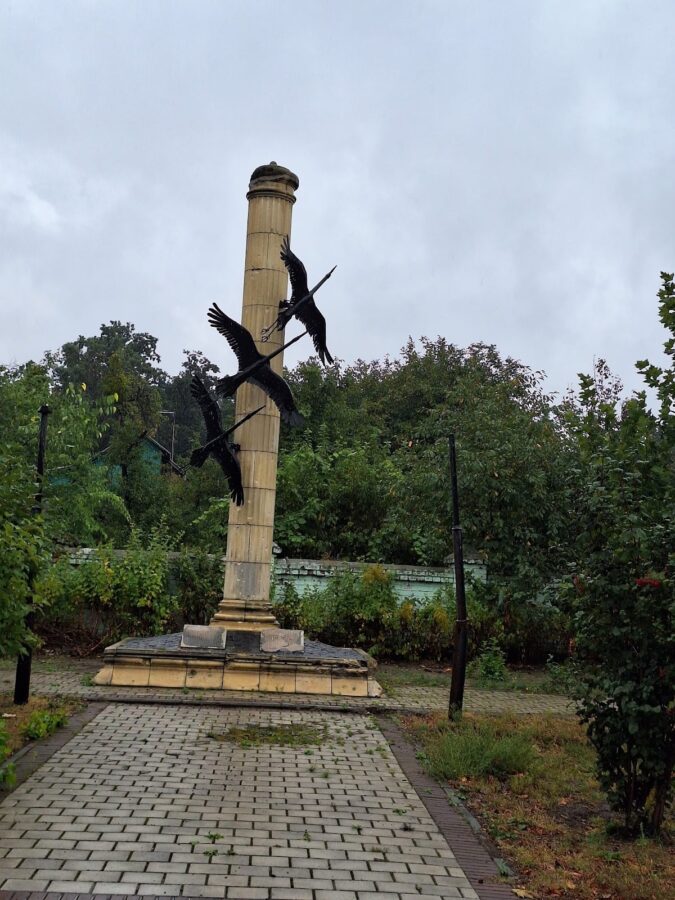 În apropierea lor se află un monument al păcii, reprezentat de trei cocori din metal, cu aripile desfăcute care par să zboare într-un stol. În cultura sovietică și post-sovietică, cocorii (Журавли, Zhuravli) sunt unul dintre simbolurile soldaților căzuți în al 2-lea război mondial. Ideea centrală este că sufletele soldaților uciși nu mor, ci se transformă în cocori albi care zboară undeva mai departe. Zborul lor în stol sugerează un drum final, fără întoarcere, către eternitate – un motiv comun în arta memorială a perioadei sovietice care glorifica moartea eroilor.