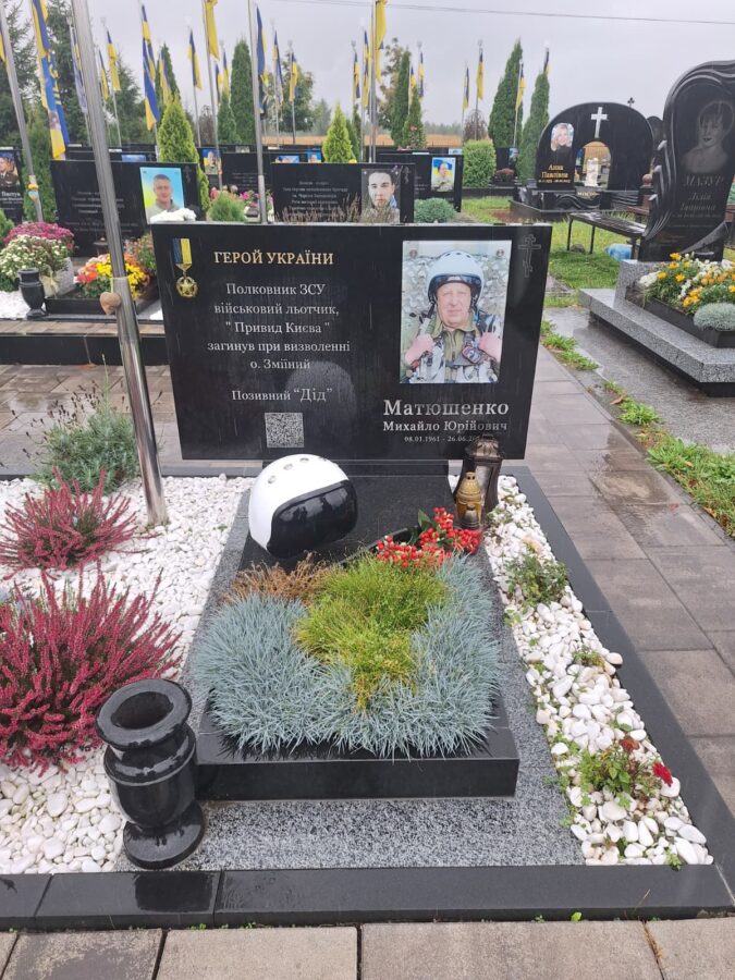 Mormântul Colonelului Mihail Iuriovici Matiușenko, un pilot militar cunoscut sub numele de cod „Bunelul” și poreclit „Fantoma Kievului”. El a fost un Erou al Ucrainei și a murit pe 26.06.2022, în timpul unei misiuni de luptă la Insula Șerpilor.