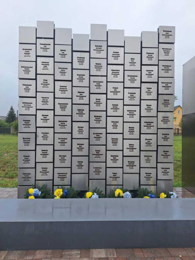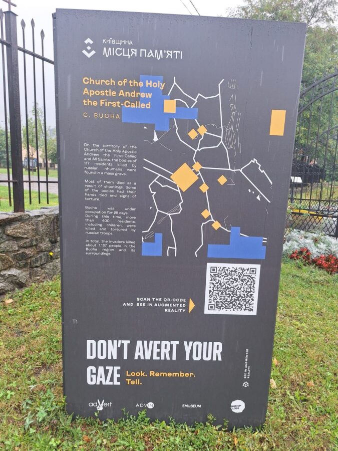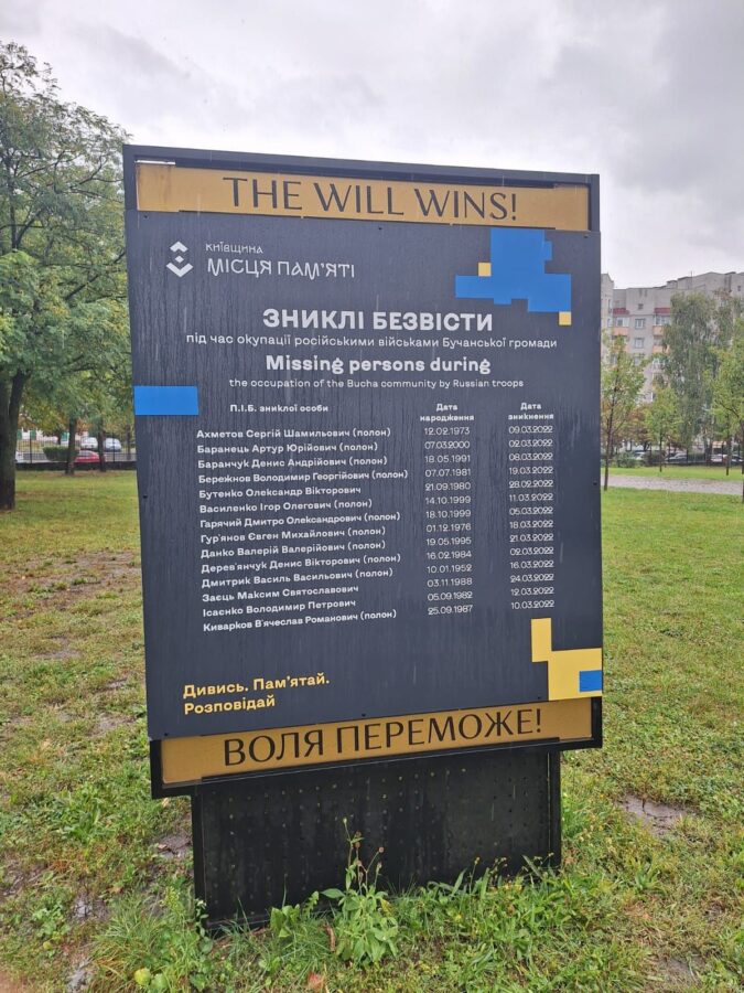 Monumentul comemorativ (ridicat în 2024) se află în curtea Catedralei Sfântul Apostol Andrei din oraș. Biserica încă poartă urme vizibile de la impactul cu obuze și artilerie, acestea fiind lăsate ca mărturie. Chiar în fața ei, terenul a fost folosit de forțele ruse pentru a săpa o groapă comună, deoarece, în timpul ocupației, armata interzisese orice fel de ceremonii și înmormântări.