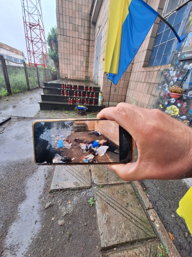 Memorialul este improvizat și se află ascuns în spatele clădirii. Accesul, similar cu o scurtătură între străzi, te duce cumva la locul faptei, direct. Urmele de gloanțe se văd încă pe scările de lângă zic (unde sunt multe lumânări lăsate) și în pereții pe care sângele a fost acoperit de vopseaua galben-albastră.