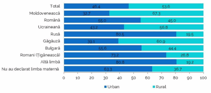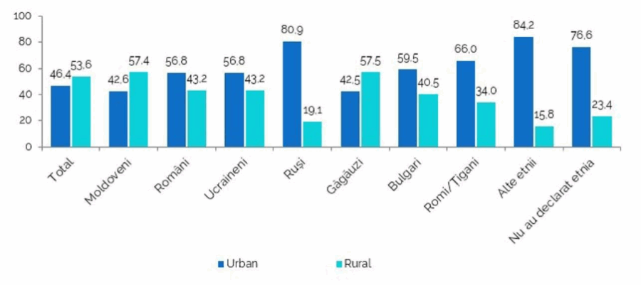 Este invers în cazul celor care se declară români, in această categorie, 56,8% locuiesc în orașe. O discrepanță și mai mare se remarcă între locuitorii R. Moldova care se declară ruși: peste 80% dintre aceștia locuiesc în centre urbane, față de numai 20 la sută în rural.