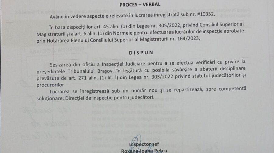 Pe 12 noiembrie anul trecut, un inspector judiciar arată, într-un referat, că propune sesizarea din oficiu pentru verificări prealabile față de șefa Tribunalului Brașov sub aspectul abaterii disciplinare privind „nerespectarea în mod nejustificat a dispoziţiilor ori deciziilor cu caracter administrativ dispuse în conformitate cu legea de conducătorul instanţei sau al parchetului ori a altor obligaţii cu caracter administrativ prevăzute de lege sau regulamente”.