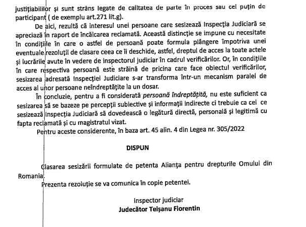 Sesizarea ADOR a fost clasată pe 1 aprilie 2025 de către IJ. Motivul invocat este acela că „În conformitate cu dispozițille art. 45 alin. 1 din Legea nr. 305/2022 privind Consiliul Superior al Magistraturii, Inspecția Judiciară se poate sesiza din oficiu sau poate fi sesizată în scris şi motivat de orice persoană interesată, inclusiv de Consiliul Superior al Magistraturii, în legătură cu abaterile disciplinare săvârşite de judecători şi procurori. Rezultă din dispoziţiile legale sus menţionate că nu orice persoană fizică sau juridică poate sesiza Inspecția Judiciară ci doar acea persoană interesată. Or, pentru a fi considerată persoană interesată aceasta trebuie să justifice un interes legitim, direct și personal în legătură cu obiectul sesizării”.