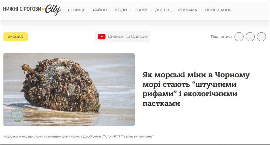 „Cum devin minele marine din Marea Neagră „recife artificiale” și capcane ecologice” a fost scris de jurnalista ucraineană Oleksanda Andrienko, cu participarea CFI, Agence française de développement médias, în cadrul proiectului Yak Vdoma Hub Bucharest, cu sprijinul Ministerului Afacerilor Externe din Franța.