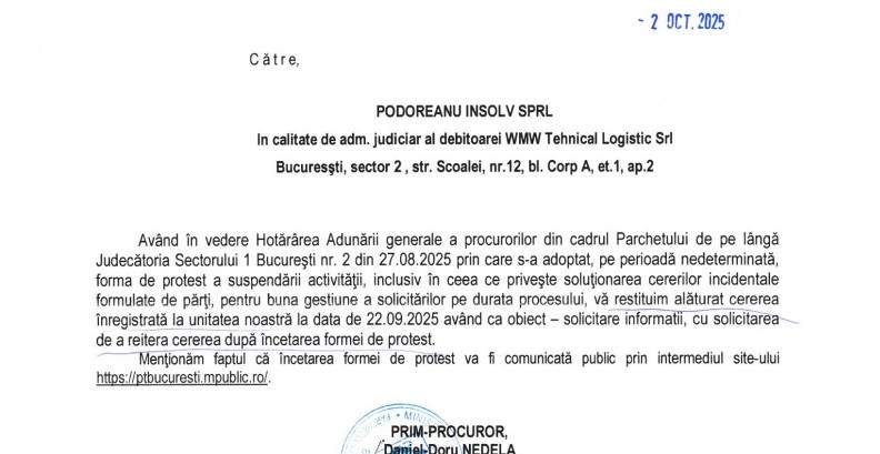În acest caz, administratorul judiciar a cerut datele de identificare a polițistului care nu și-a făcut treaba pentru a-l reclama. Răspunsul Parchetului este jenant. „Având în vedere Hotărârea Adunării generale a procurorilor din cadrul Parchetului de pe lângă Judecătoria Sectorului 1 București din 27.08.2025 prin care s-a adoptat, pe perioadă nedeterminată forma de protest a suspendării activităţii, inclusiv în ceea ce privește soluționarea cererilor incidentale formulate de părţi, pentru buna gestiune a solicitărilor pe durata procesului, vă restituim alăturat cererea înregistrată la unitatea noastră la data de 22.09.2025 având ca obiect – solicitare informații, cu solicitarea de a reitera cererea după încetarea formei de protest”.