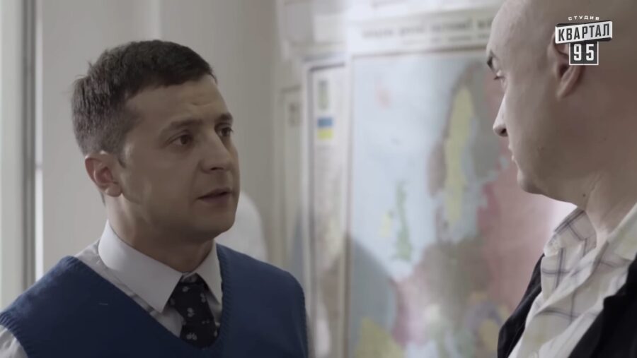 Cu patru ani înainte, serialul În slujba poporului debuta cu un discurs pasionant al personajului principal, un profesor de istorie care urma să devină președinte după ce tirada plină de injurii împotriva corupției devine virală: „De ce toți oamenii cinstiți sunt proști, iar cei deștepți sunt hoți?”, striga personajul jucat de Zelenski. „Ce fel de oameni suntem noi, de votăm în continuare pentru acești mincinoși nenorociți, știind că sunt escroci?” Personajul urma să petreacă următorii ani înfruntând corupția profund înrădăcinată în clasa politică ucraineană.
