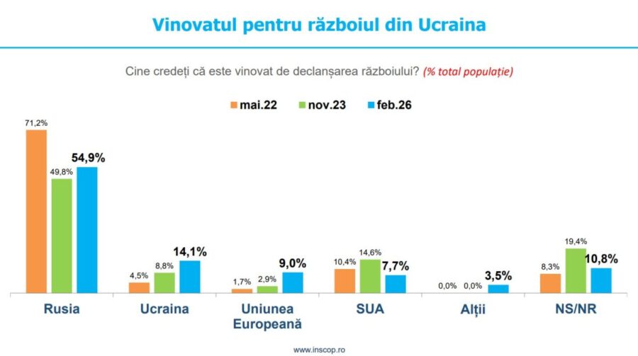 Datele sociologice recente din România oferă o radiografie relevantă a acestei transformări. Conform sondajului INSCOP Research realizat la comanda New Strategy Center (28 ianuarie – 6 februarie 2026, cu eșantion reprezentativ de 1100 respondenți și marjă de eroare de ±3%), 54,9% dintre români consideră Rusia vinovată pentru declanșarea războiului. Majoritatea rămâne clară, însă scăderea față de mai 2022 (71,2%) este semnificativă. Nu este doar o variație statistică, ci semnul unei erodări a consensului inițial. Nu cred că asistăm la o simpatie bruscă a românilor față de Kremlin. Mai degrabă, vedem efectul uzurii a percepțiilor. În primele luni după 24 februarie 2022, reacția publică era aproape instinctivă: agresiune evidentă, victimă clară, solidaritate spontană. Astăzi, după patru ani, războiul nu mai provoacă șoc, ci oboseală. Iar oboseala este teren fertil pentru relativizare și divergență a opiniilor.