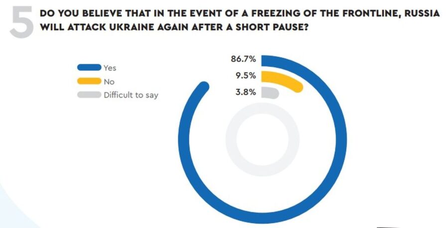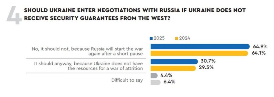 În același timp, 64,9% dintre ucraineni afirmă că Ucraina nu ar trebui să intre în negocieri de pace fără garanții clare de securitate din partea Occidentului. Iar 86,7% cred că, dacă războiul ar fi înghețat, Rusia ar ataca din nou după o perioadă scurtă. Acest nivel de neîncredere structurală este definitoriu. Pentru majoritatea ucrainenilor, concesia nu este soluție, ci preludiu al unei noi agresiuni.
