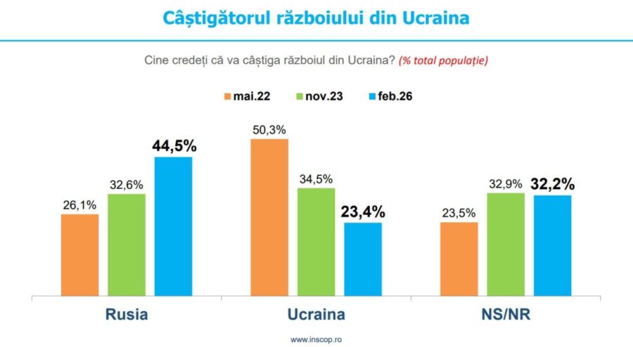 Diferența dintre 55% atribuind vina Rusiei în România și peste 85% susținând integrarea europeană în Ucraina nu este doar o diferență de opinie, ci de experiență istorică imediată. Și mai relevant este cum privesc românii viitorul războiului. 44,5% cred că Rusia va câștiga, 23,4% cred că Ucraina va câștiga, iar restul sunt indeciși. Percepția probabilității victoriei influențează direct atitudinile morale: dacă aproape jumătate dintre români cred că Rusia va învinge, crește tentația de a susține o „încheiere rapidă”, chiar cu concesii.