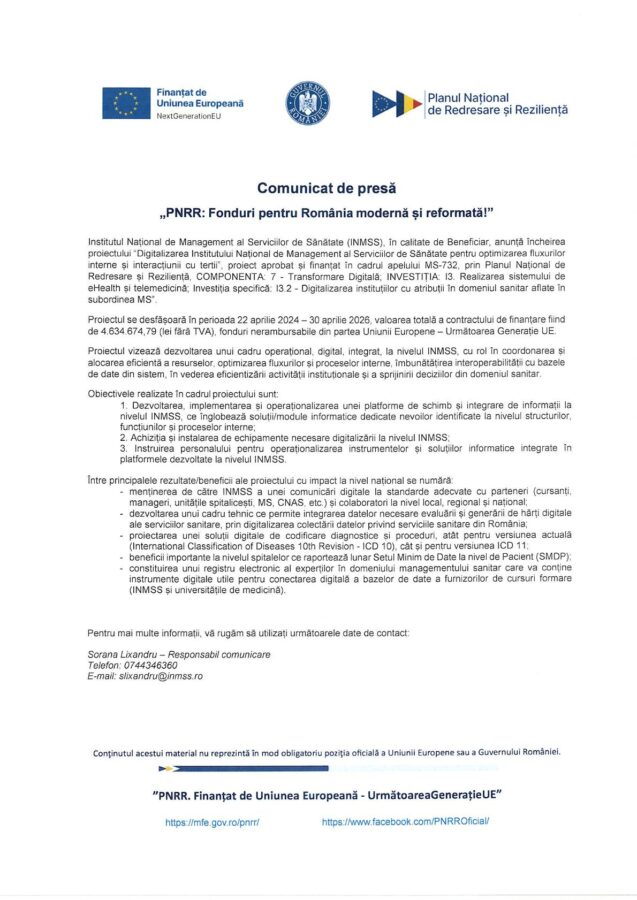Institutul Național de Management al Serviciilor de Sănătate (INMSS), în calitate de Beneficiar, anunță încheierea proiectului “Digitalizarea Institutului Național de Management al Serviciilor de Sănătate pentru optimizarea fluxurilor interne și interacțiunii cu terții.
