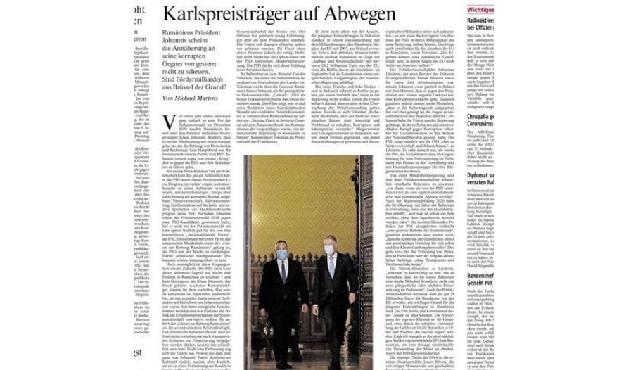 Un alt fragmente din FAZ:”Acum un an totul părea foarte simplu. Înainte de alegerile parlamentare din decembrie 2020, președintele României Klaus Johannis, care este oficial deasupra partidelor politice, a precizat că votul a vizat nimic mai puțin decât salvarea democrației și a statului de drept. Principalul său dușman era Partidul Social Democrat sau PSD pe scurt. Johannis a vorbit chiar despre un „război” care trebuia purtat împotriva PSD”.